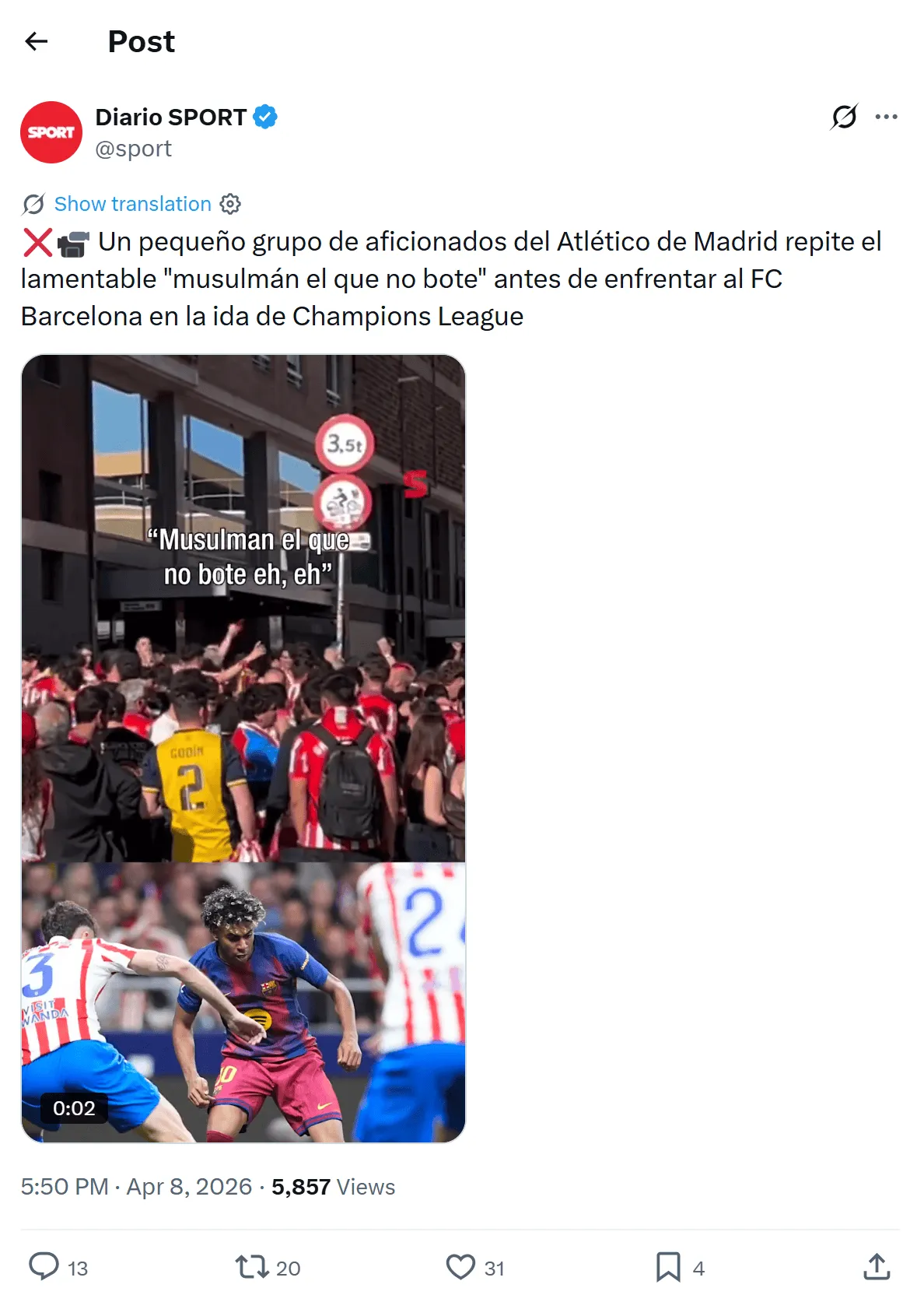 从现场流传的视频来看,一小部分马竞球迷在赛前集结,并喊出了“Musulmán el que no bote”(不跳的人就是穆斯林)的口号,被认为带有明显的宗教歧视意味。