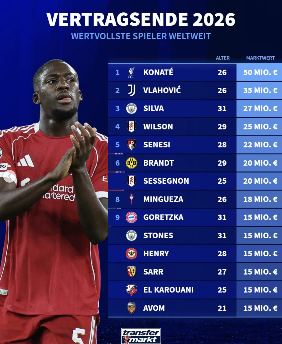 利物浦中卫科纳特以5000万欧居首;尤文的弗拉霍维奇和曼城的B席分别以3500万和2700万排名二三。
