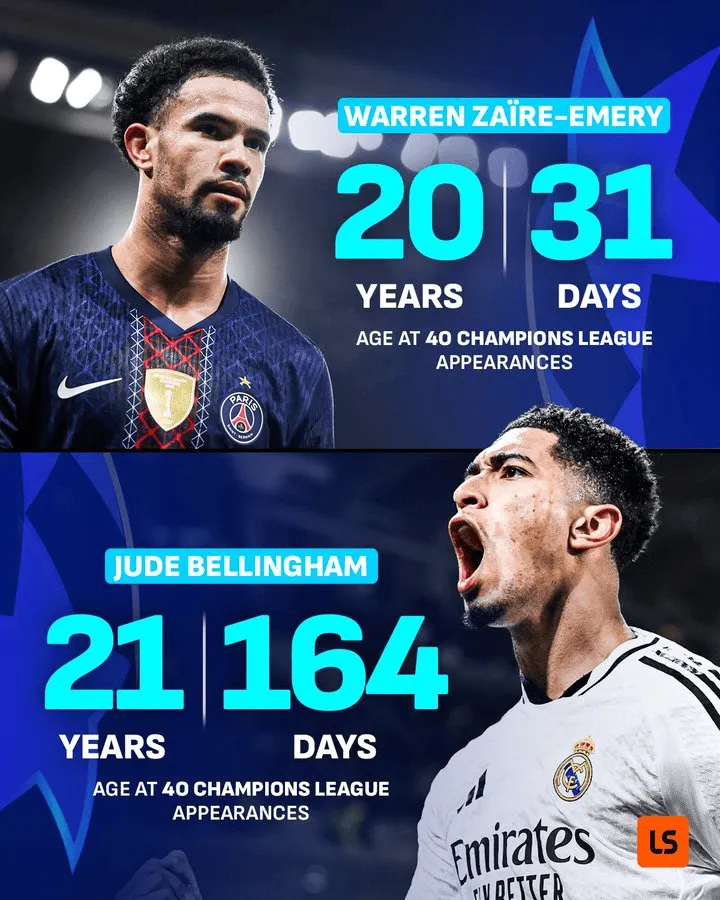 根据LiveScore的统计,20岁31天的扎伊尔-埃梅里成为欧冠历史上出战40场比赛的最年轻球员,打破了贝林厄姆(21岁164天)之前所保持的纪录。