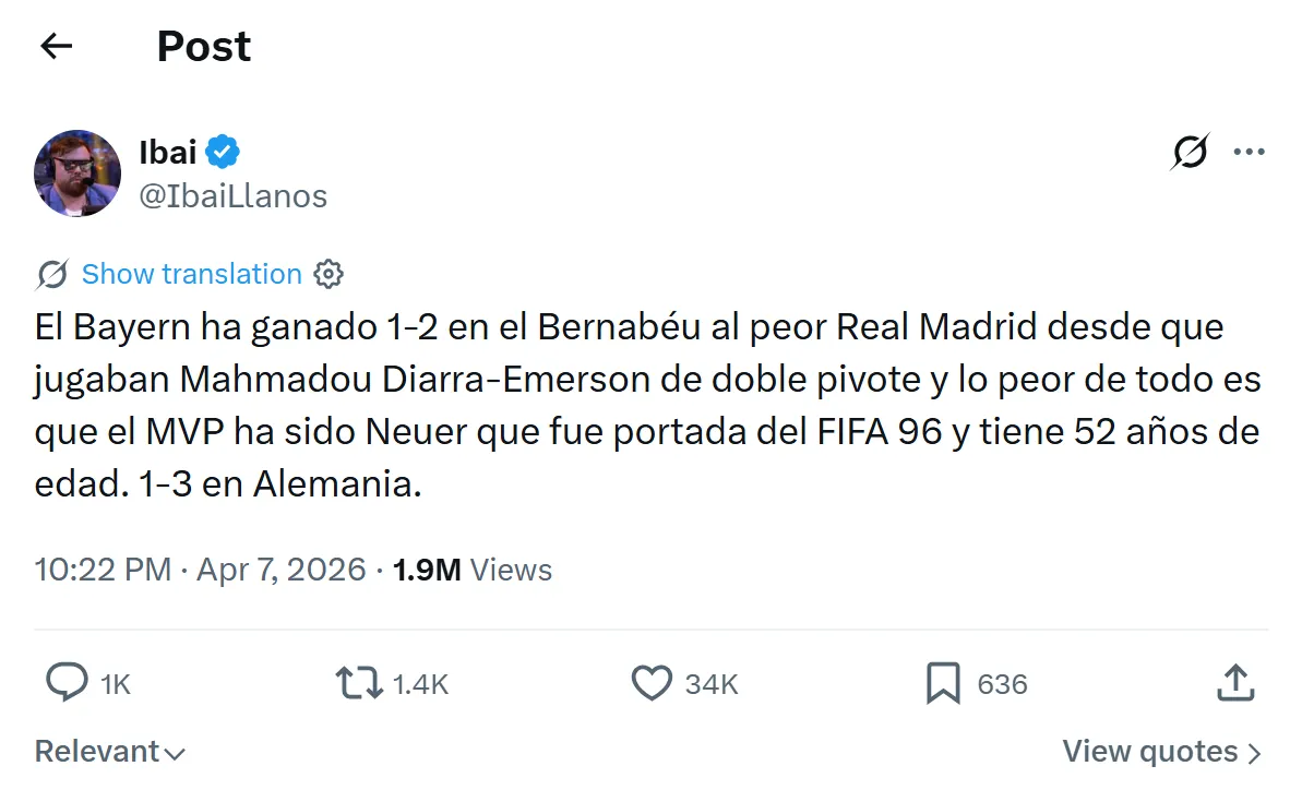 他在个人社交媒体上对比赛进行了点评,并给出了自己的预测。伊拜首先写道:“拜仁在伯纳乌2-1击败了近些年来最差的一支皇马,甚至要追溯到迪亚拉和埃默森搭档后腰的时期。更离谱的是,本场最佳球员还是诺伊尔——一个上过FIFA 96封面、‘已经52岁’的人。”在谈到次回合时,伊拜预测皇马将会在客场3-1取胜完成逆转。