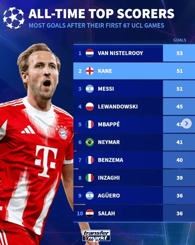 [流言板]欧冠生涯前67场进球榜:范尼53球居首,凯恩、梅西并列第二
