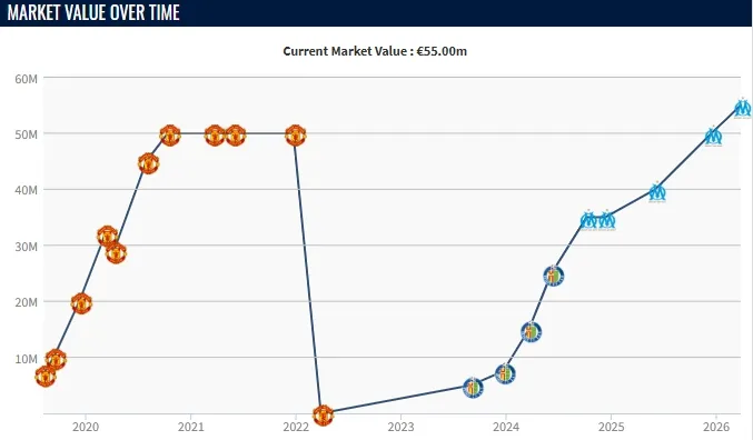 格林伍德在效力曼联期间因为场外事件,身价曾降为0。格林伍德在2024年夏窗以2600万欧转会加盟马赛,之后身价持续上涨,就在德转上一次更新时,他的身价已经追上了曼联时期的最高值。