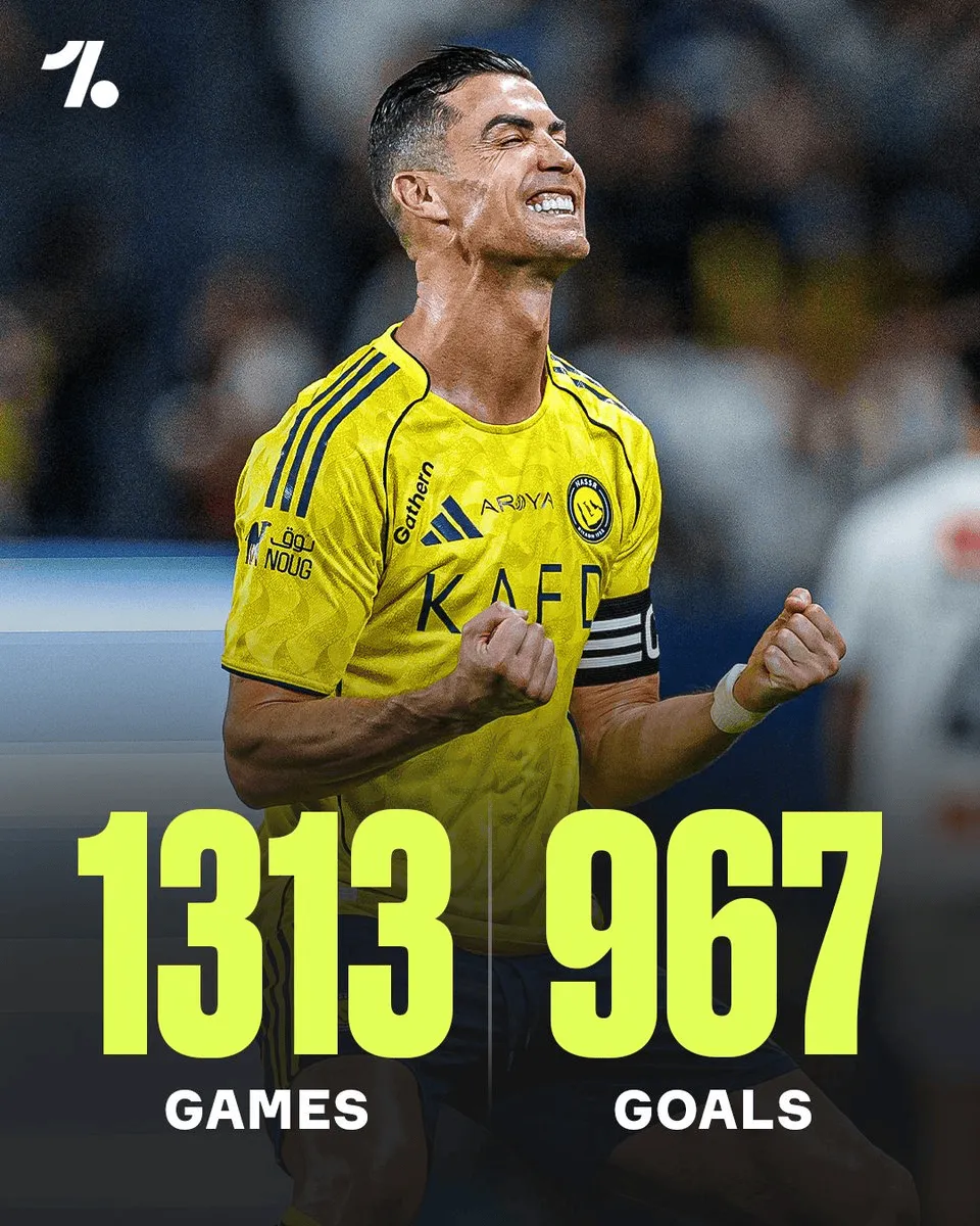 根据最新的统计数据,C罗已经在1313场比赛中打入了967个进球,离1000球的历史性的里程碑只差33个进球。